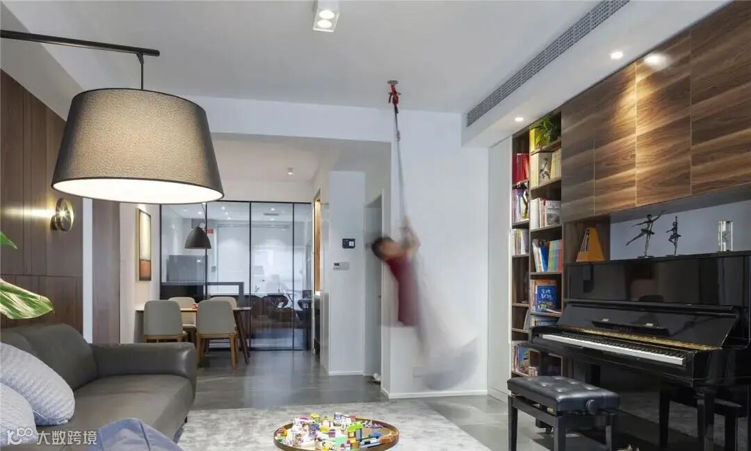 舞蹈房设在客厅内。将客厅内的大型家具抛弃,将更多的空间流出来打造成舞蹈、健身房,与孩子形成身体上的互动,能够培养亲子之间的感情。
