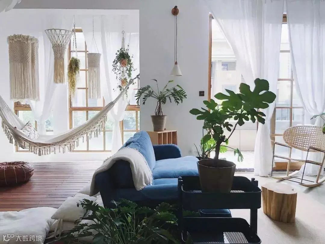 榻榻米相结合。除了常规的沙发电视,沙发后方空间还有一个超大的木质榻榻米,茶余饭后,大家可以在上面看书喝茶聊天,落地窗前准备了吊床,每个人都喜欢在上面躺一下,悠闲自在。