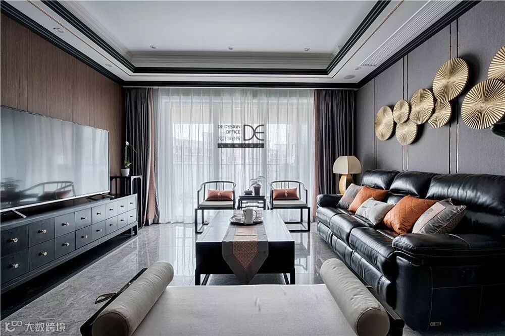 用纯皮艺的沙发布置在新中式风格的客厅里面,效果也是相当的华丽端庄而精致。
