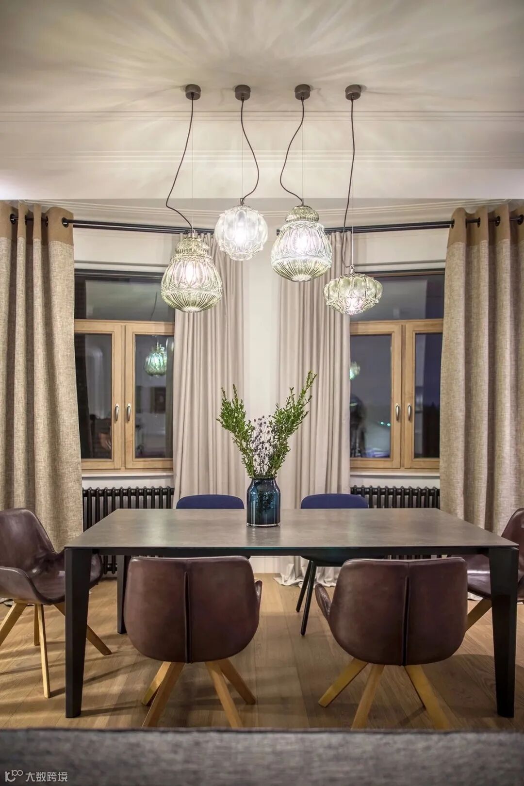 自然感通常通过原木配色、家具的粗糙肌理感、或者做旧金属线条、雕花玻璃灯罩等等来体现,能往自然的气息中注入工艺美感。