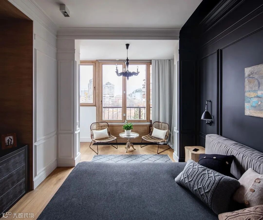 阳台大部分采用原木元素,保证空间有一部分“呼吸感”,放眼望去,一个卧室竟有种复古与现代碰撞的感觉。