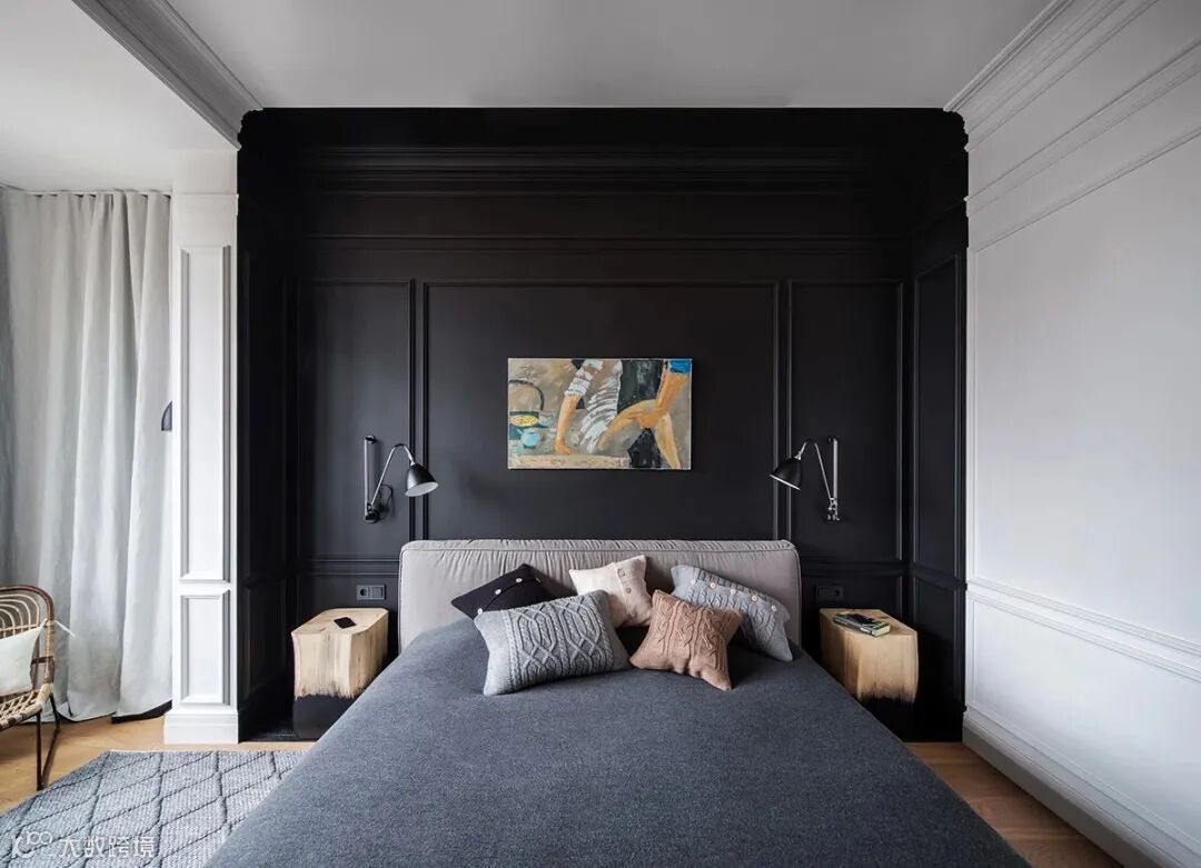 在私人化较强的卧室里,业主大胆地这样做了,留床后背景墙来打造个性区域。