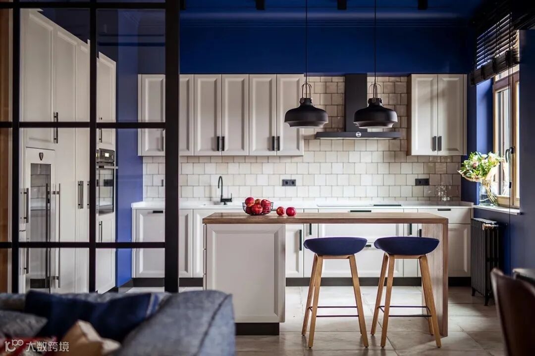 偏高的颜色饱和度与恰好的亮度,搭配哑光白色,经典白蓝配色带来强烈的视觉冲击感,时尚与欢快奠定了厨房的风格。