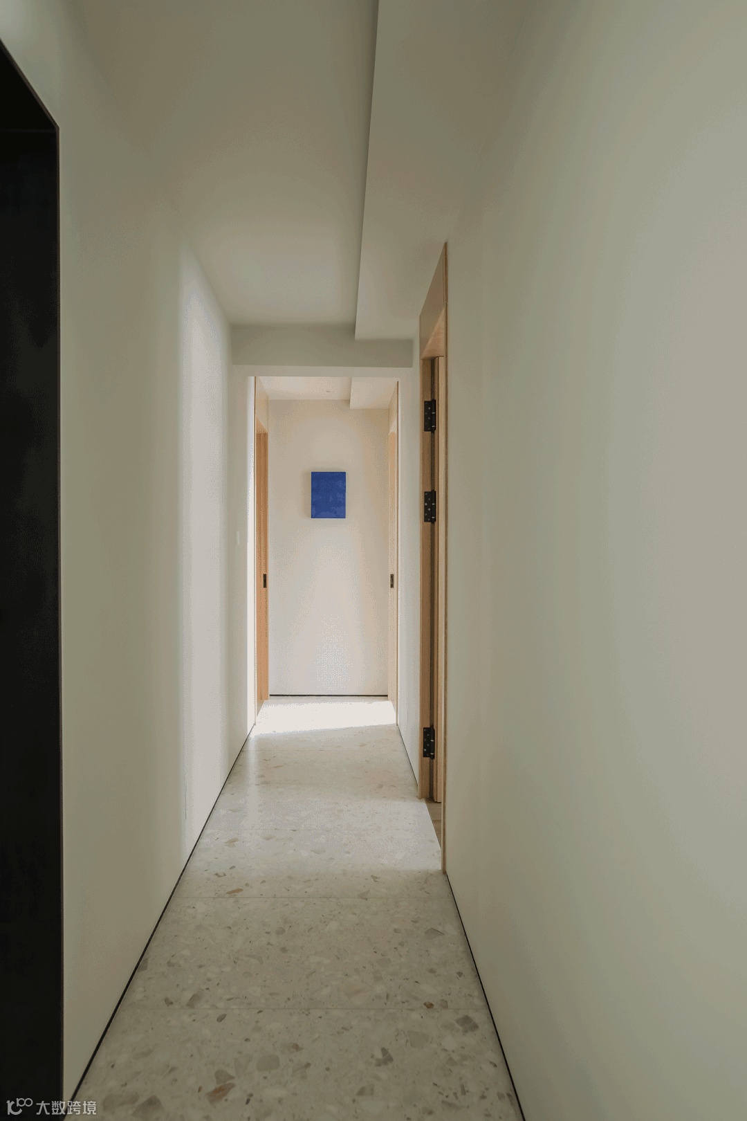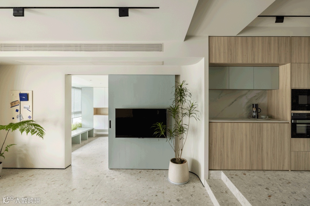 考虑到老人偶有看电视以及孩子网课的需要,我们保留了电视的功能,区别于传统电视固定挂放在墙上,而是和客厅与玄关间的移门结合。需要的时候我们让它成为主角,而大部分时候,电视随移门靠在墙角,保持客厅和玄关开敞的状态,弱化本身的存在感。