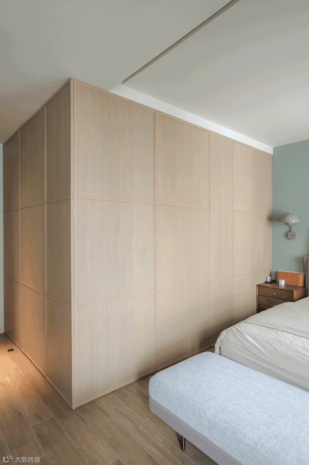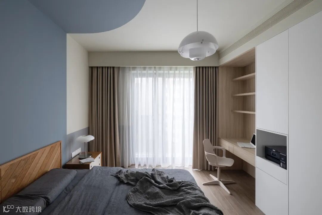 主卧采光上佳,室内延续了女主人偏爱的雾绿色,搭配灰木调的柜体,空间氛围自由放松,并未做过多的繁琐设计。