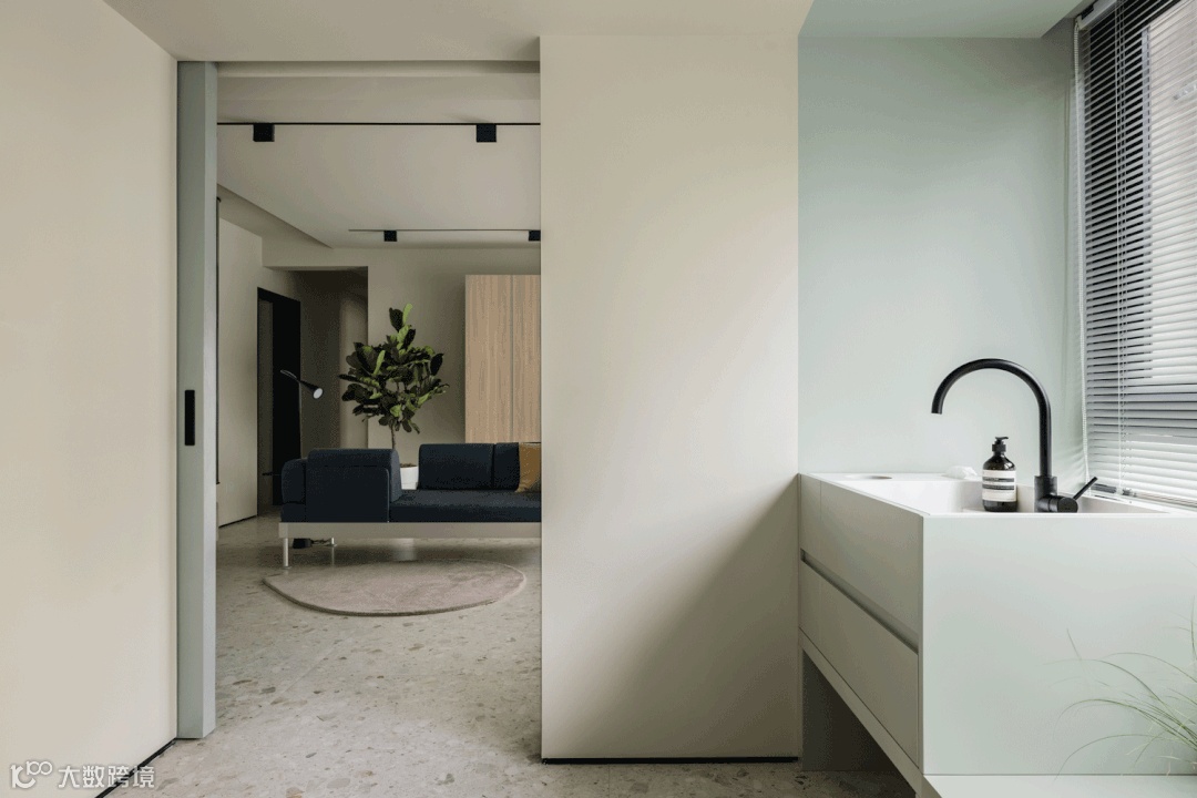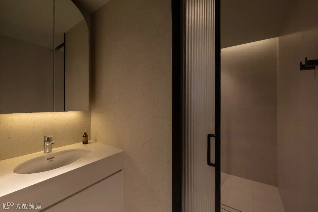 客卫采用了米色的水磨石砖墙地通铺,模糊墙地交界,倍化空间视觉。洗漱台单独隔离出来,便于有娃家庭早晚高峰的使用。淋浴房+马桶间和洗漱台用单面磨砂的长虹玻璃口袋门弹性隔断,保证空间感的同时又保证了隐私。