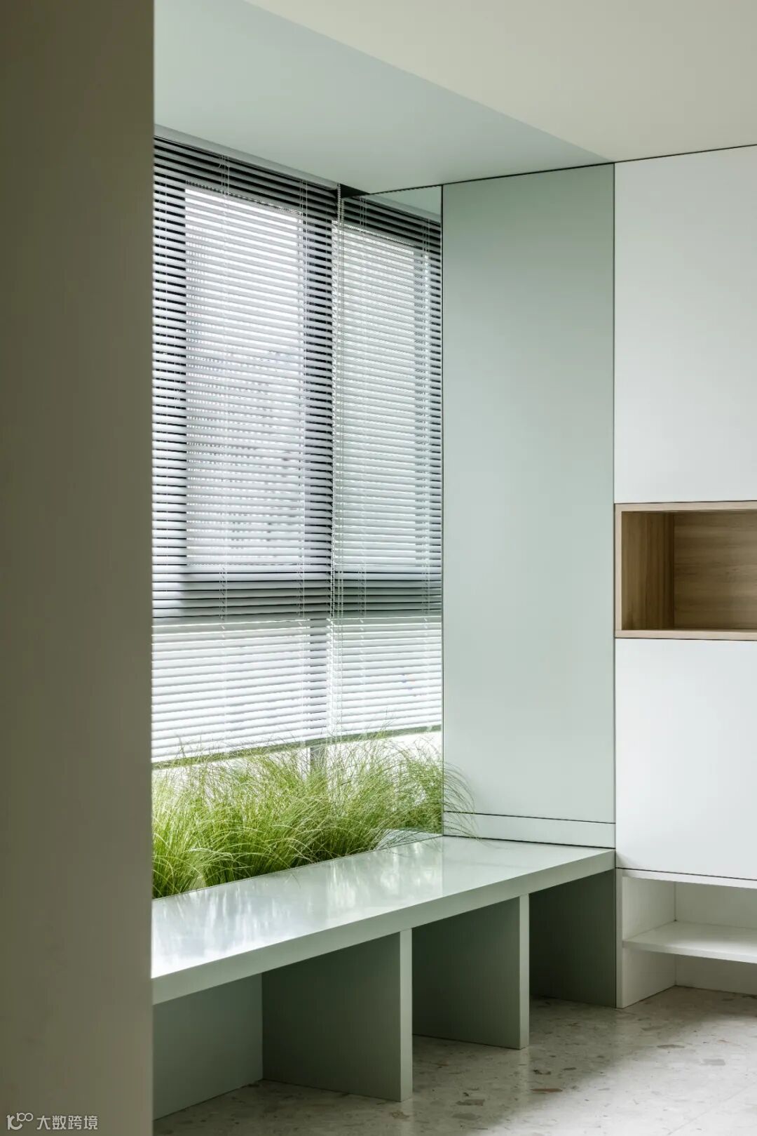 玄关设计了屋主入户需求一体化解决方案,鞋柜到顶能收纳80双鞋左右,靠窗的柜体用镜面做了封板,遮蔽管体同时又延伸窗景。在落地窗一侧设计了换鞋卡座+植物槽,种植槽的植物是盆装,可以随季节换上不同的植物,轻松制造出入户的美好感觉,功能颜值两不误。