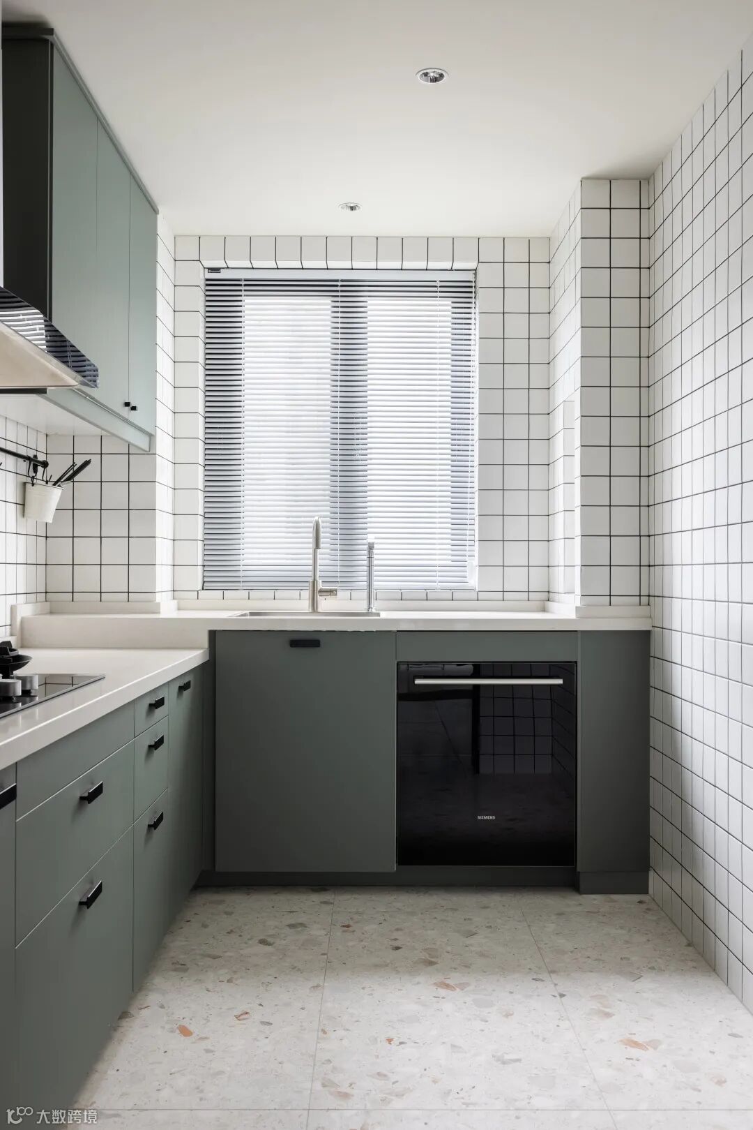 橱柜是宜家米多系统,橱柜高度根据屋主身高定制,操作起来更加轻松应手,灰绿色门板搭配白色小方砖堆砌出视觉层次,空间敞亮整洁。