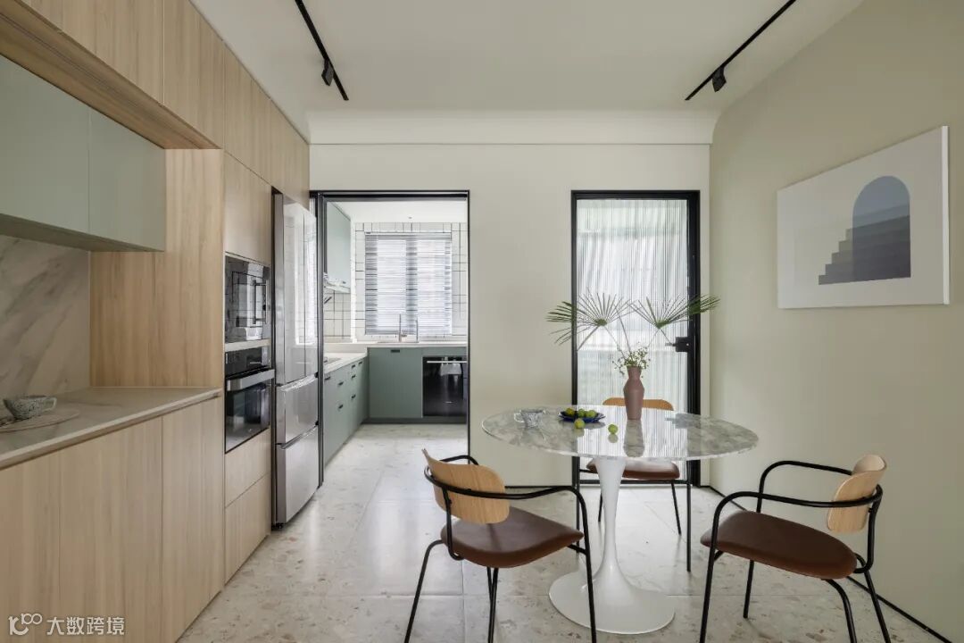 客餐厨房相连,考虑到外婆每天都会为家人做饭,为避免油烟在室内四散,厨房特地做了口袋移门,平时收起移门即是开放厨房。