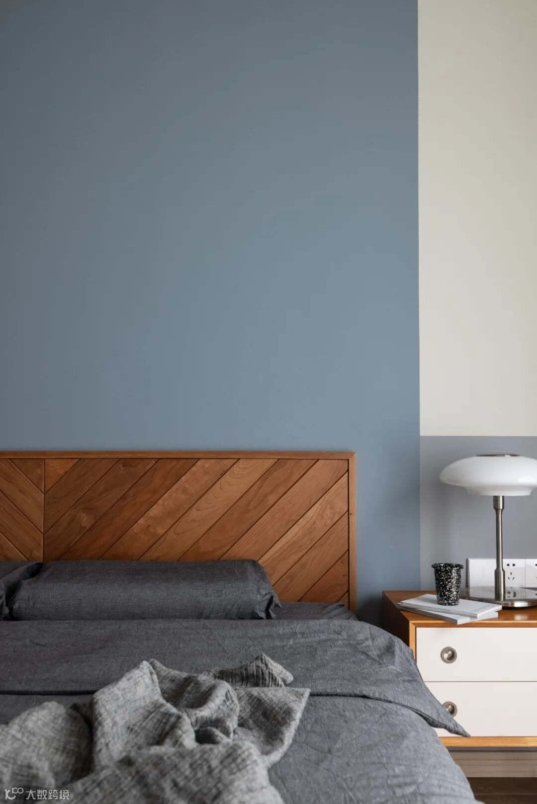水蓝色结合樱桃木的床档,奠定了宁静温润的空间氛围,也让老人沉浸放松安宁的环境中。