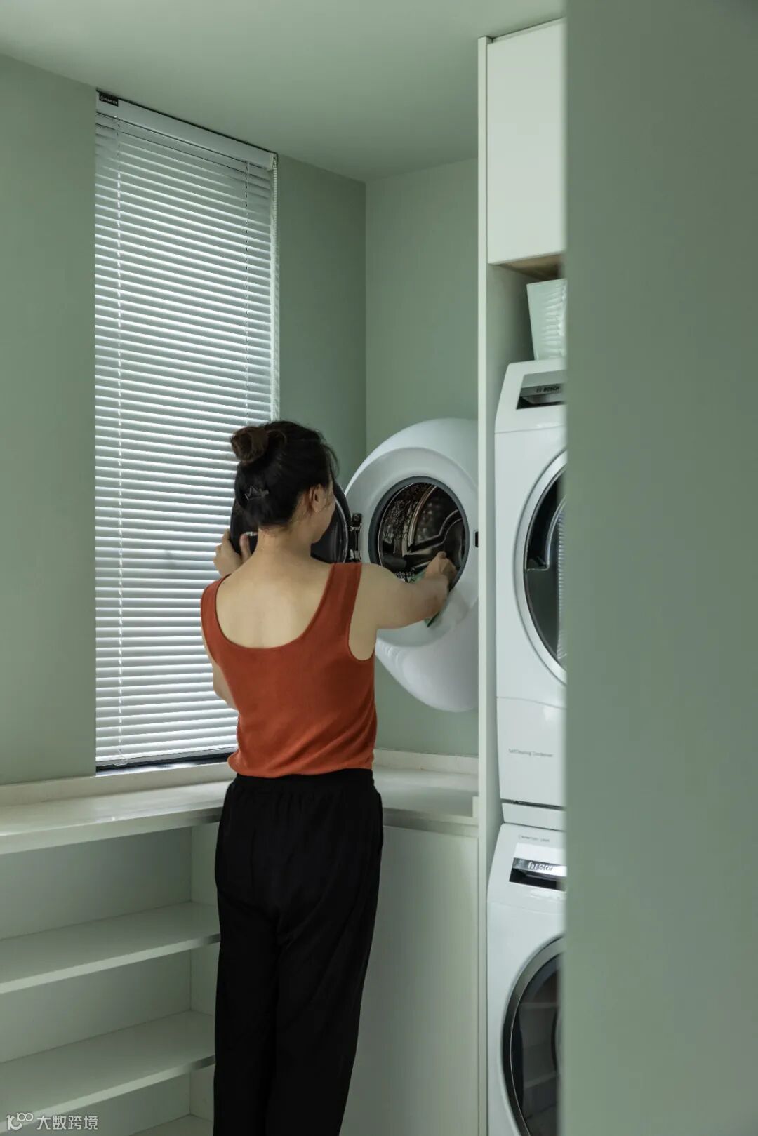 与厨房一墙之隔是家政间,有娃家庭增加一台挂壁洗衣机能节省不少清洗衣物的时间,同时搭配洗烘工作站,家政工作也变得轻松便捷。