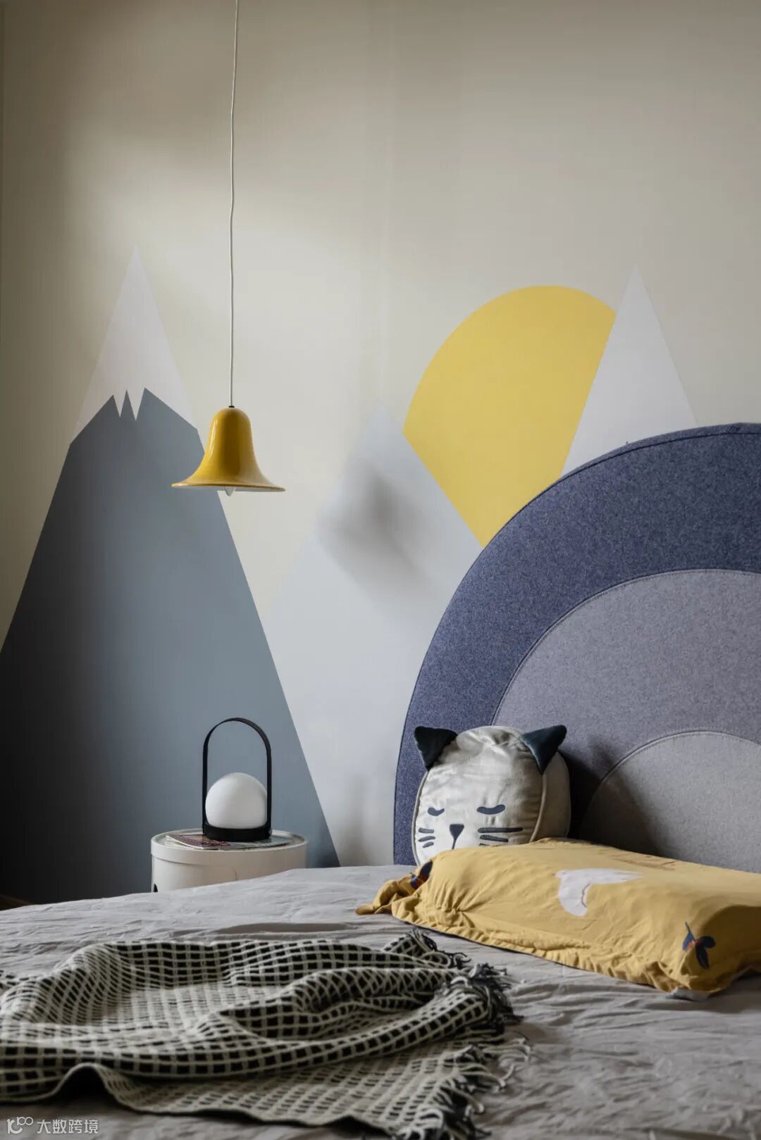 利用儿童房的好采光,使用孩子喜好的色彩用乳胶漆做一面简单墙画,凸显个性,较高彩度的几何图案让空间充满趣味。