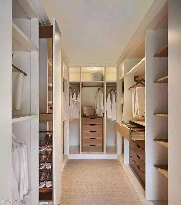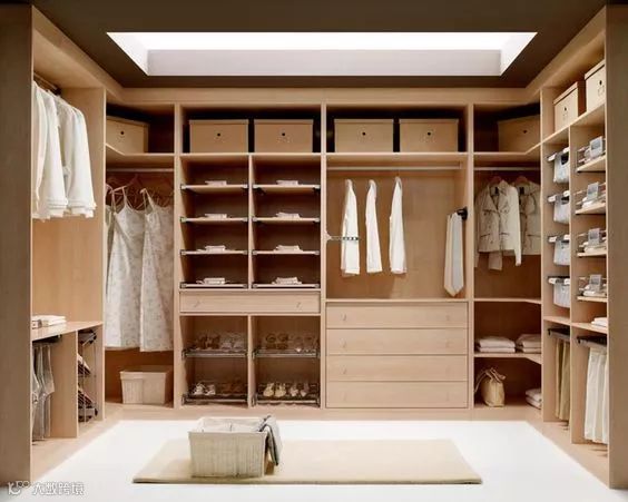 但是“先天条件不足”的衣帽间,也可以通过巧妙的空间布局来安排:正方形衣帽间多采用U型布局,最小尺寸应该控制在长宽比例为2.5m*1.5m左右。如果空间够大,也可以做得更大一点。