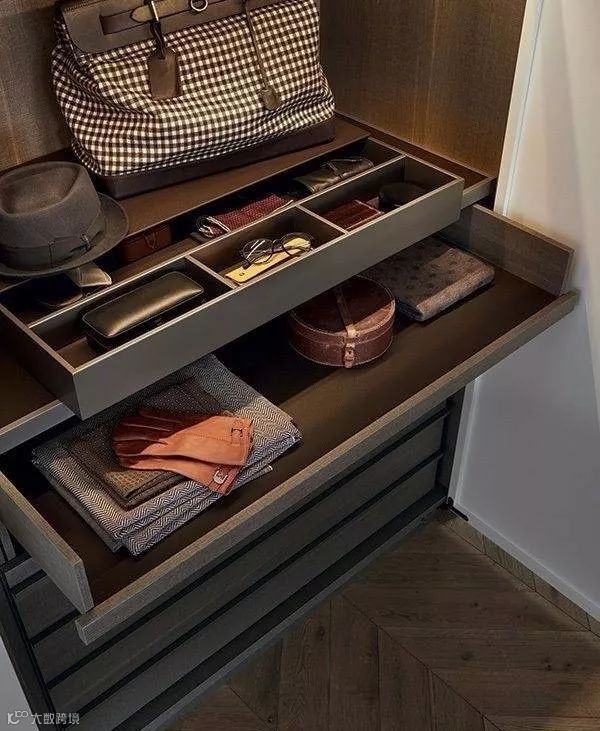 大件区主要用来叠放被褥、毯子、窗帘、软席等,按照日常使用频率来分配的话,它一般位于衣帽间的顶部,并采用分格设计区分开来。