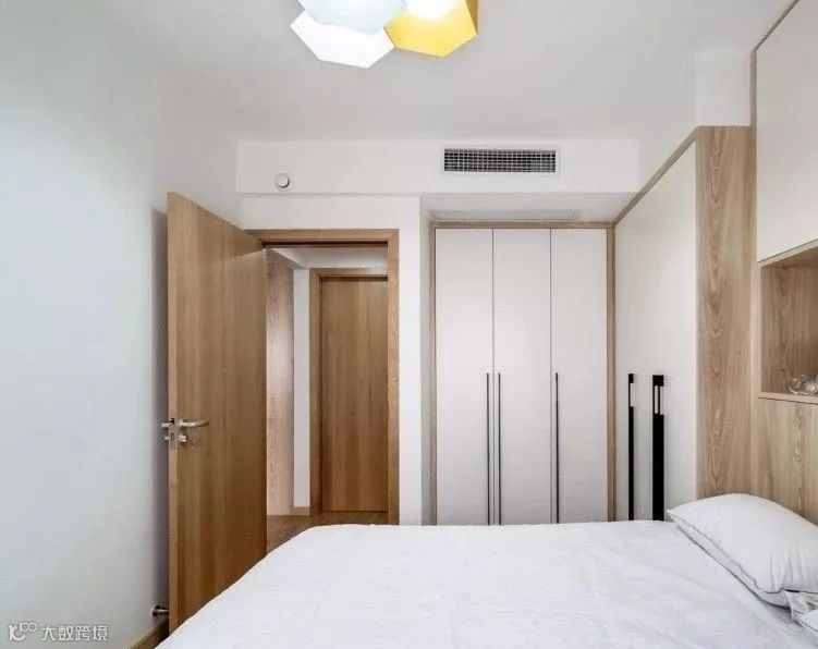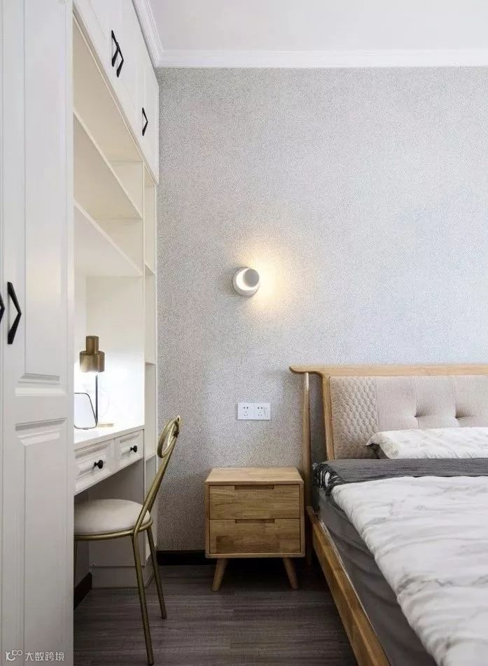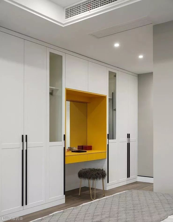 衣柜的颜色尽量是纯色,或者和墙体保持一致,这样在视觉上有放大的效果。并且,如果实在碍于空间大小的限制,用了推拉门,真心建议也尽量选择质感好的磨砂玻璃,不要带花纹,也不要中间有花纹拦腰截断。