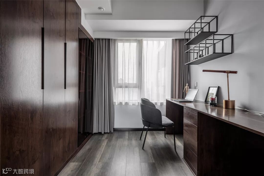 书房的墙面刷成了灰色,双人位的书桌方便屋主夫妻一起工作,书桌上方的置物架和后方满墙的柜子结合起来,就不用担心书房储物空间不够了。