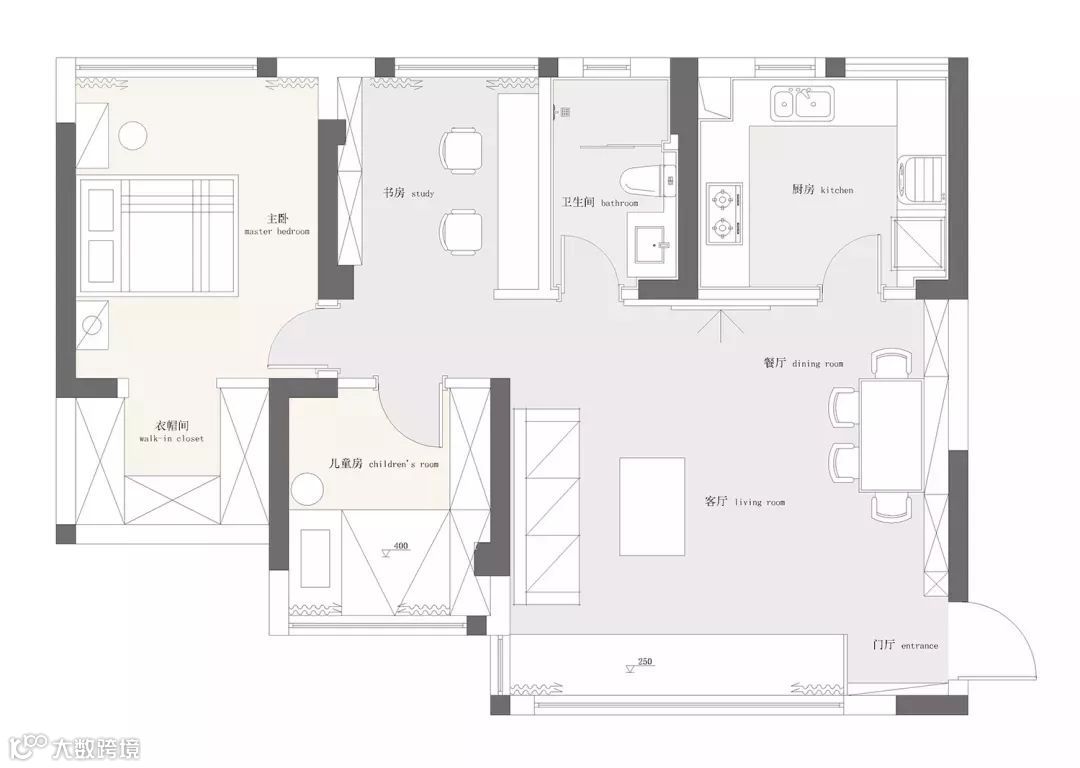 客厅的布局是非常独特的,书房和茶几对着餐桌椅,没有正对着电视。而靠窗的位置做了一排的飘窗,也可以起到代替沙发的效果。