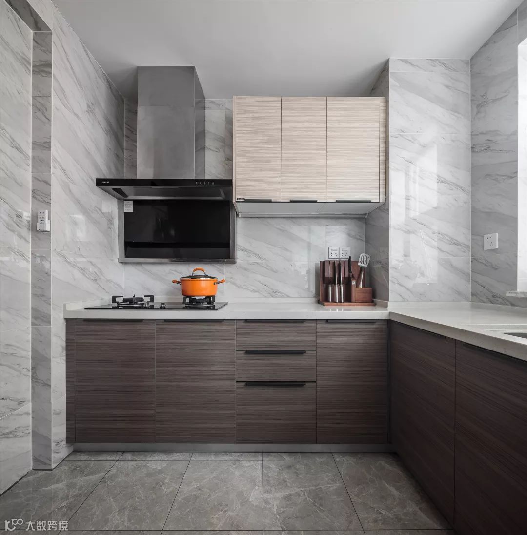 厨房内部延续了客餐厅的配色方案,U字形的橱柜布局方案让厨房拥有更多的储物空间,中间留下的通行空间也还非常宽敞。