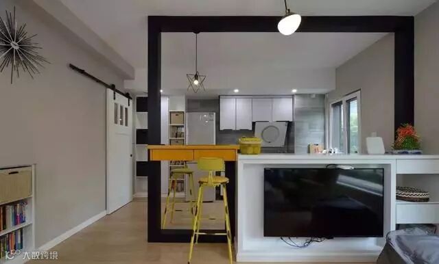 木作半高隔断柜,兼具电视背景与橱柜机能,左侧延伸小吧台作为简餐区,暖木色和亮黄吧台椅提亮空间色彩。