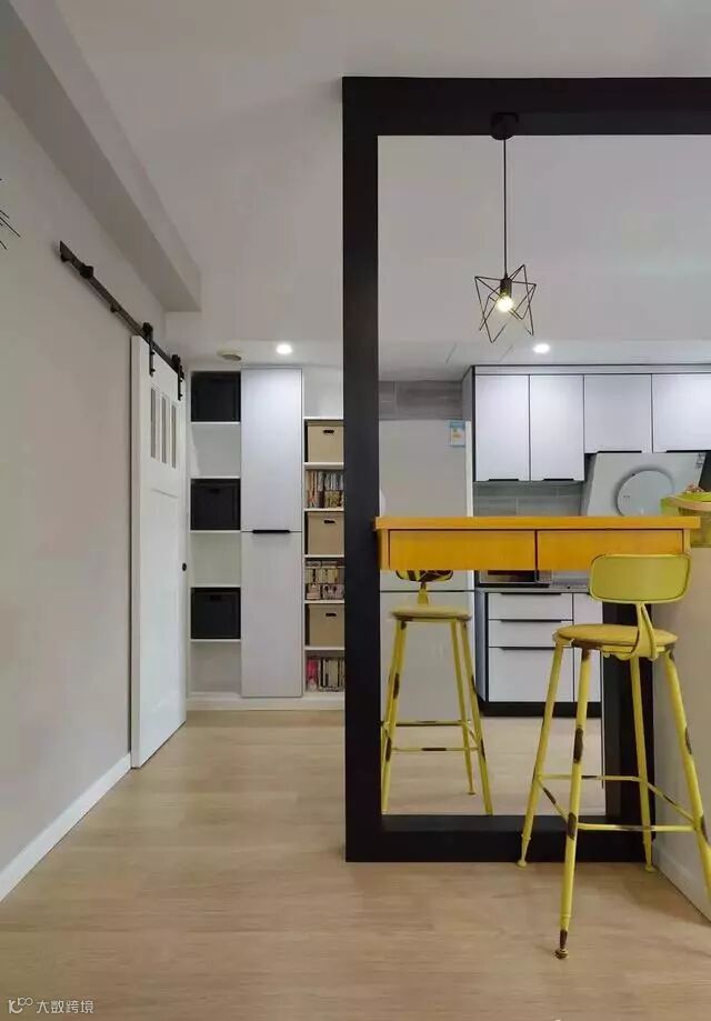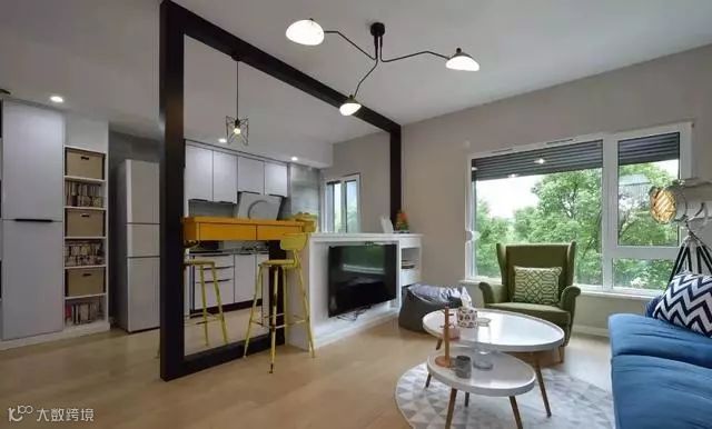 木作黑色隔断框架,分隔客厅与开放式厨房场域,并创造一种框景效果。