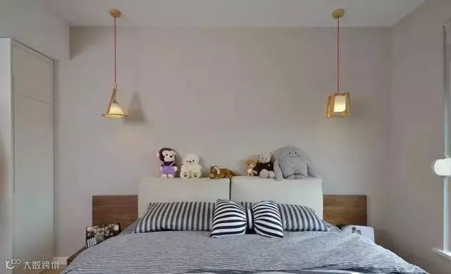 床头两侧的暖光吊灯,可做阅读台灯之用。