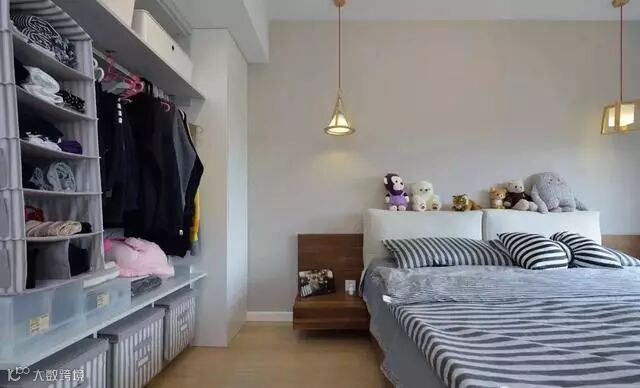 由于过道中已有独立的衣帽间,主卧床侧没有打造传统的衣柜,做了开放式的收纳空间,收纳功能不亚于衣帽间。