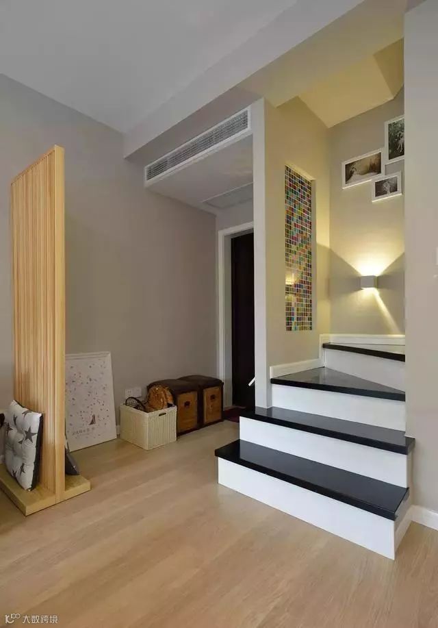 入户的七彩马赛克与楼梯的色彩形成鲜明的对比,楼梯的灯光也是别具艺术感的。