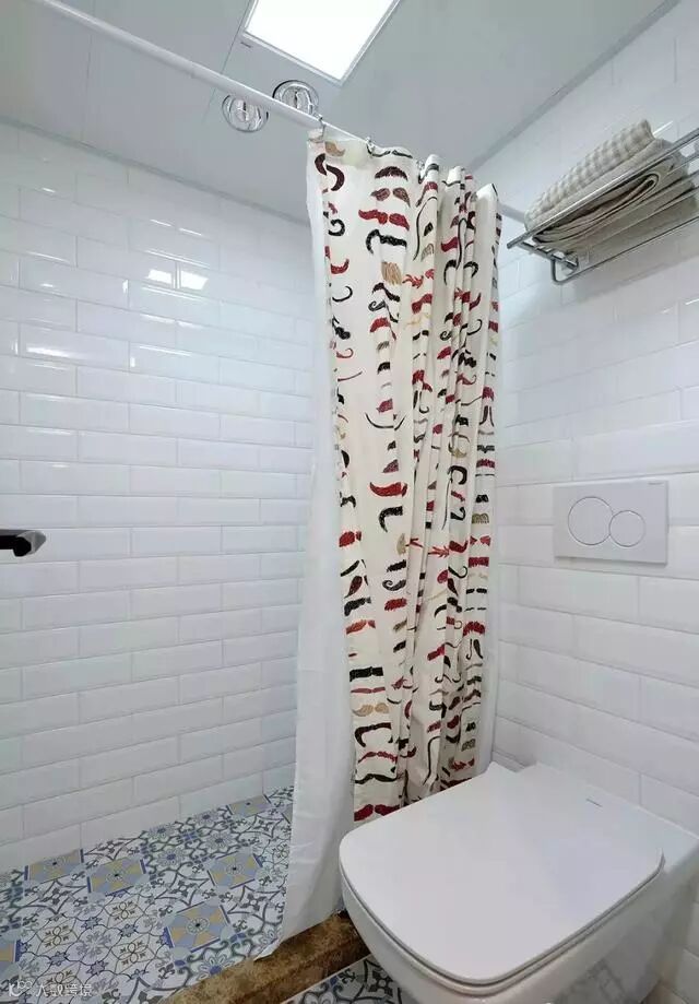 主卫花砖地面搭配北欧风小白砖,清新文艺。以浴帘进行干湿分区,入墙式马桶,简约省空间。