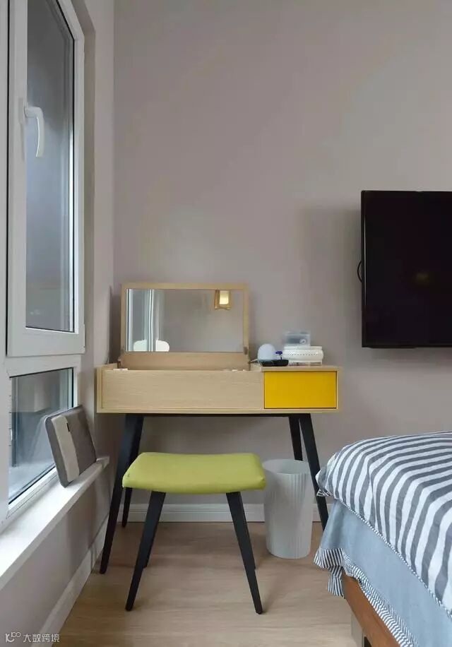 床尾的角落增设了梳妆台,满足女主人的梳妆需求,简洁轻便不占地方,盖上盖子还可做书桌使用。