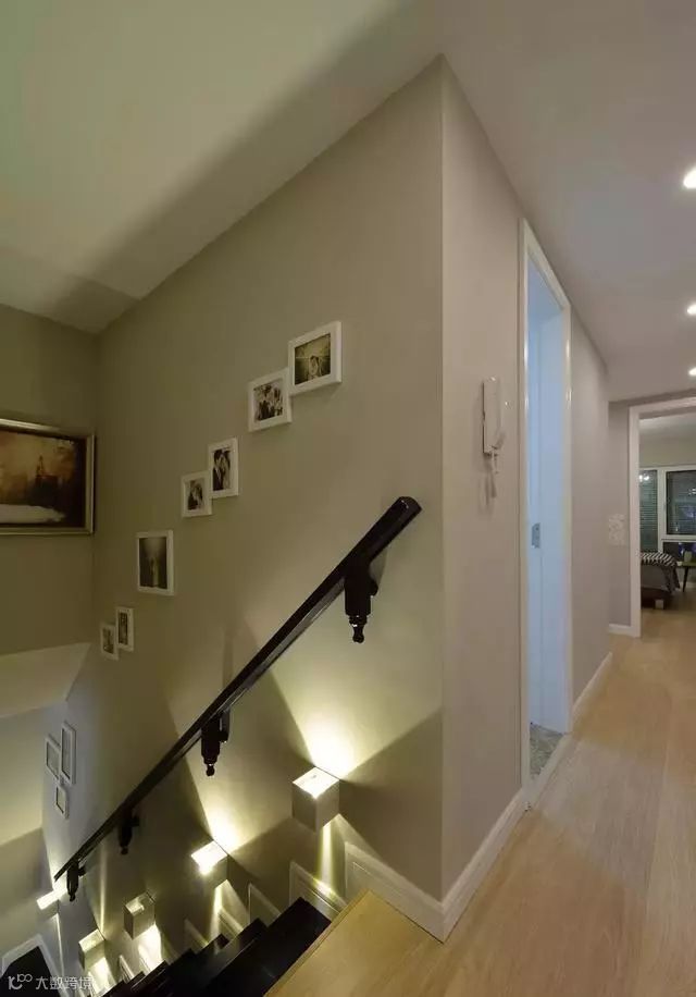 黑色楼梯步搭配黑色扶手,装几盏壁灯形成夜灯效果,光与影的结合,安全又美观。