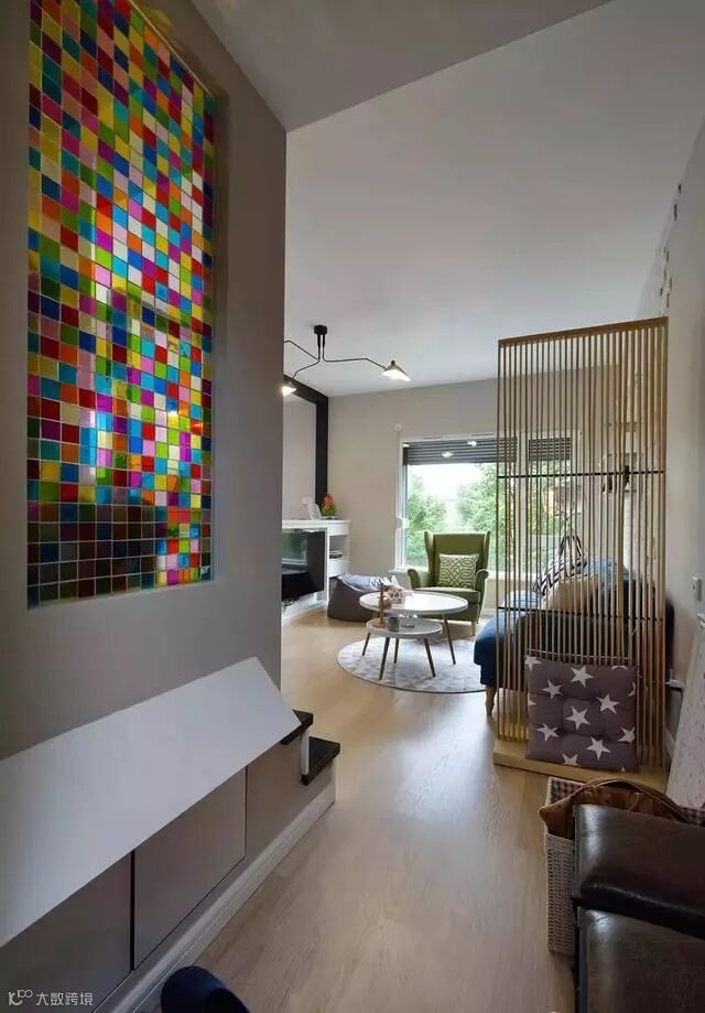 玄关处以马赛克彩绘玻璃作为隔断,色彩绚丽,又增加的空间采光与通透性。