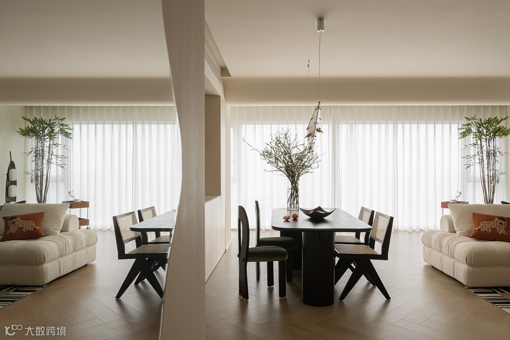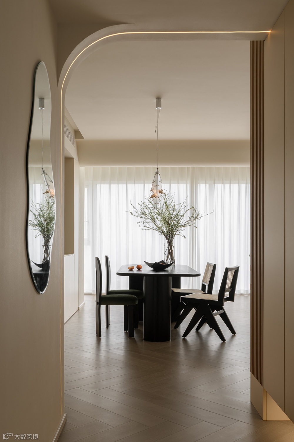 复古味道的餐桌椅让空间变得更沉稳,见光不见灯的暖色光无形中营造着空间温暖氛围,门洞上的弧形线条又在细节处表达着温柔。