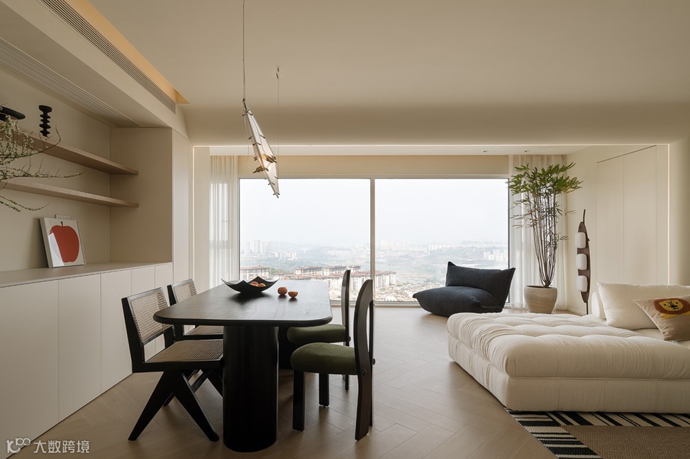 阳台纳入客厅,落地窗将窗外景色尽收眼底,一盆绿植在纯色空间亮眼跳脱,蕴含生机向上的力量。