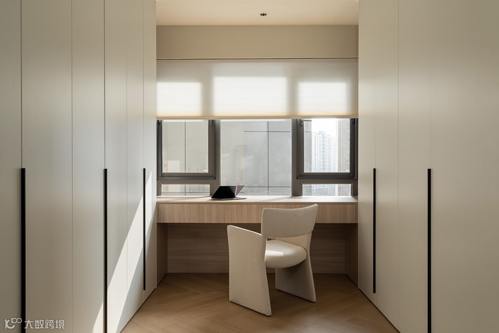 一进入卧室就能感受到空间的包裹感,温柔软糯的氛围和宽大的白色面包床无一不在视觉和感受上拂去疲倦,只想“躺平”。