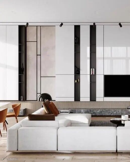 当然除了具有很好的装饰效果和不落灰之外,如果家里缺少储物空间不妨试试储物柜电视墙+嵌入式电视的设计。这样家里很多东西都可以统统放在里面了,储物功能直接翻倍。