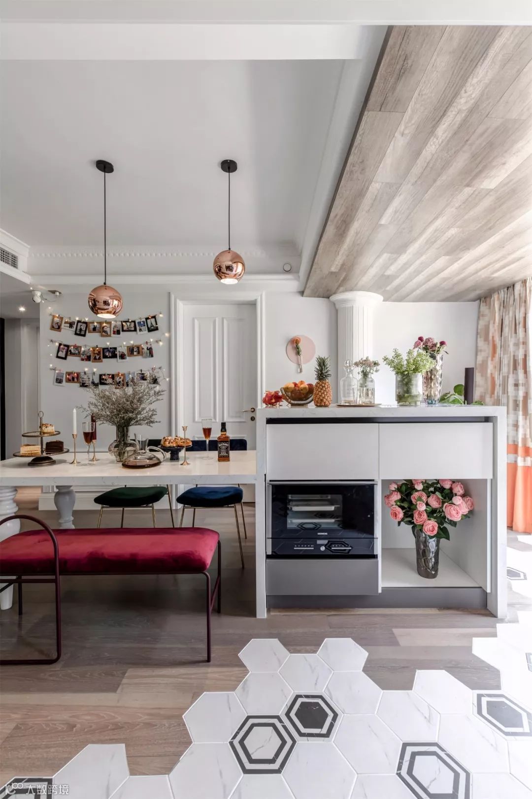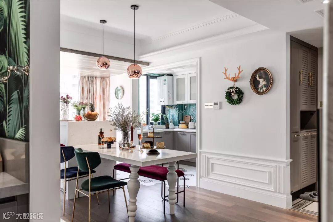 餐桌与岛台采用的是一体化设计,时尚的同时带着一点点复古感,桌面上餐具以及装饰品的点缀,让用餐环境显得十分轻盈时尚。