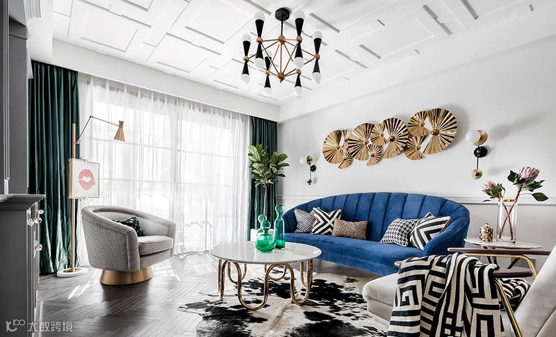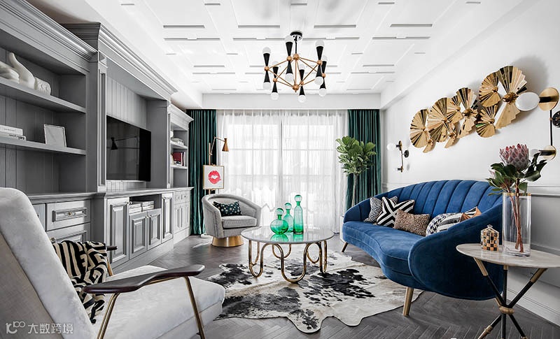 ▲ 宝蓝色丝绒沙发、千鸟格单椅、大理石茶几、墨绿色窗帘 ... 相互配合,又在明度和饱和度上各自变化,增加了视觉的丰富性。
