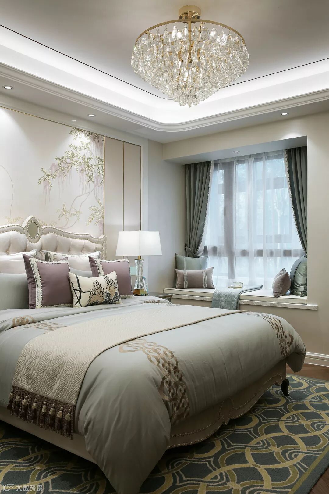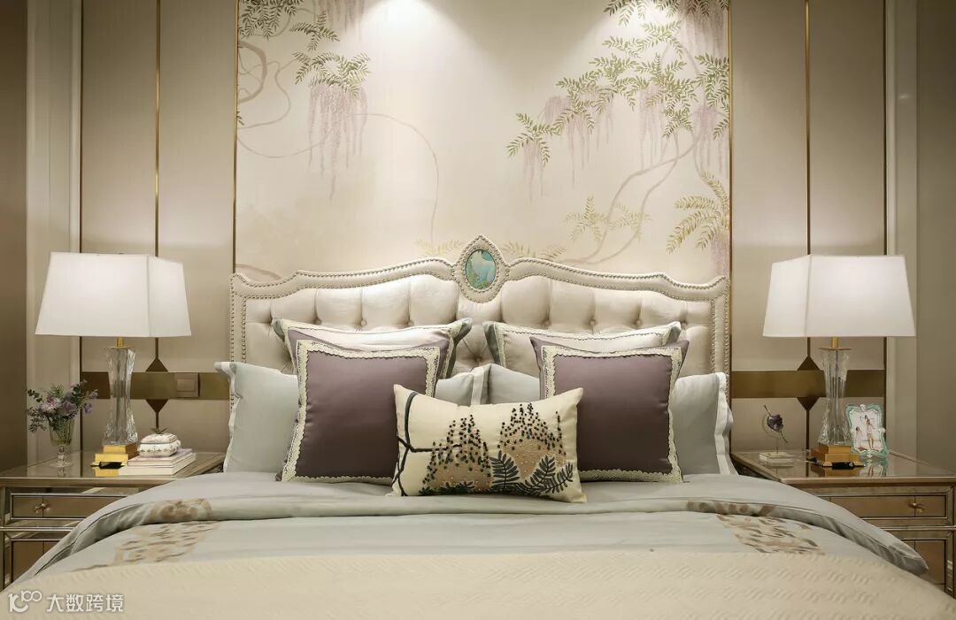 ▲ 主卧,浅咖和银灰的配色大气沉稳,床头的壁画、壁灯以及天花板吊灯则采用金色,与窗帘色调相搭配,显得既优雅而不突兀。