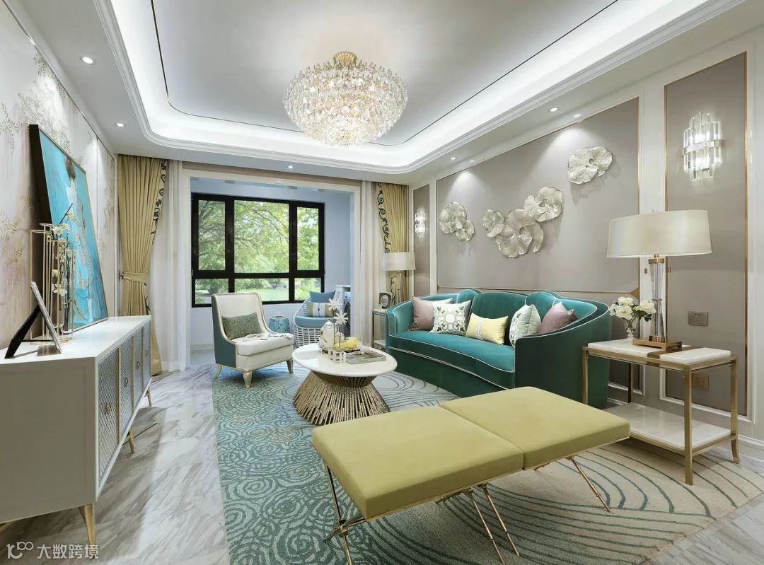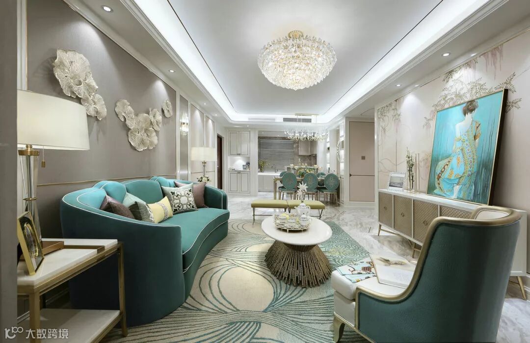 ▲ 天鹅绒沙发舒适度非常高,再配以松软的靠枕,让人不由得想深陷其中。家具多选用小细腿的造型,给视觉留出呼吸的空间。