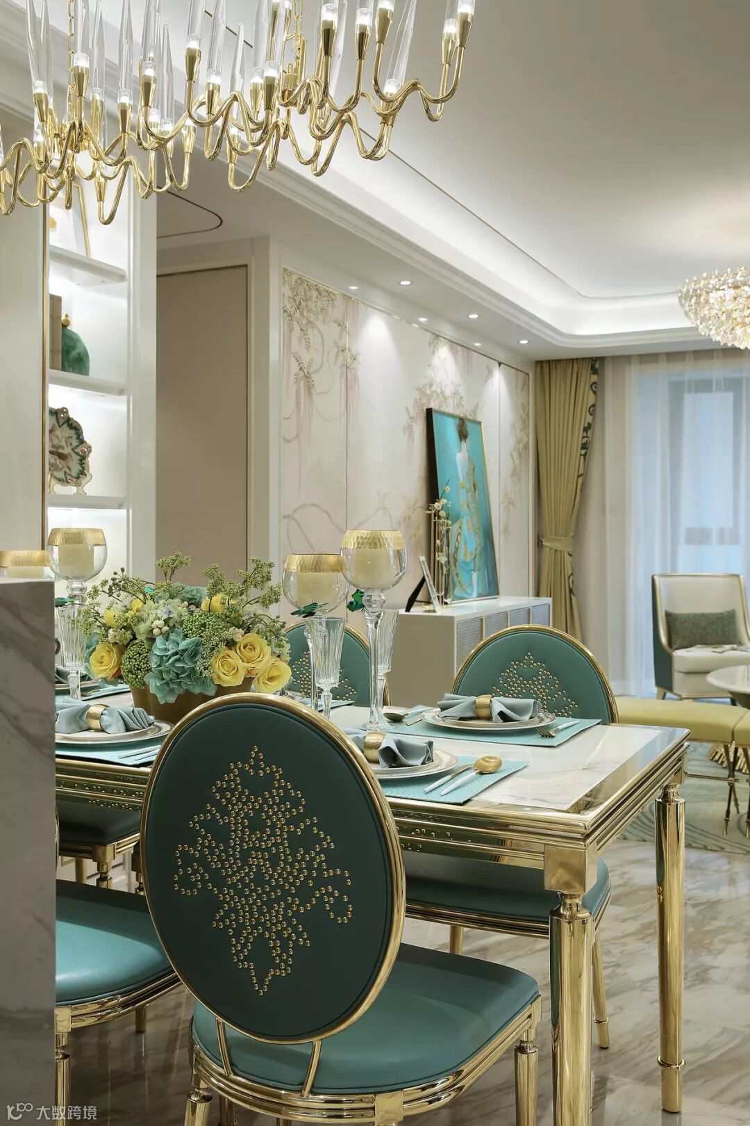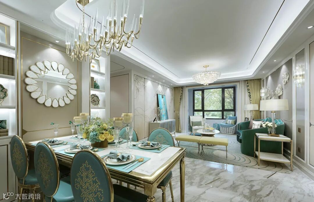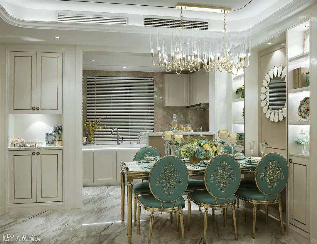 餐厅和客厅间没有明显的隔断,视野开阔。地面甄选大面积意大利灰石材,工艺考究的餐桌、餐椅与高贵金烛台吊灯,法式简约韵味无限弥漫。