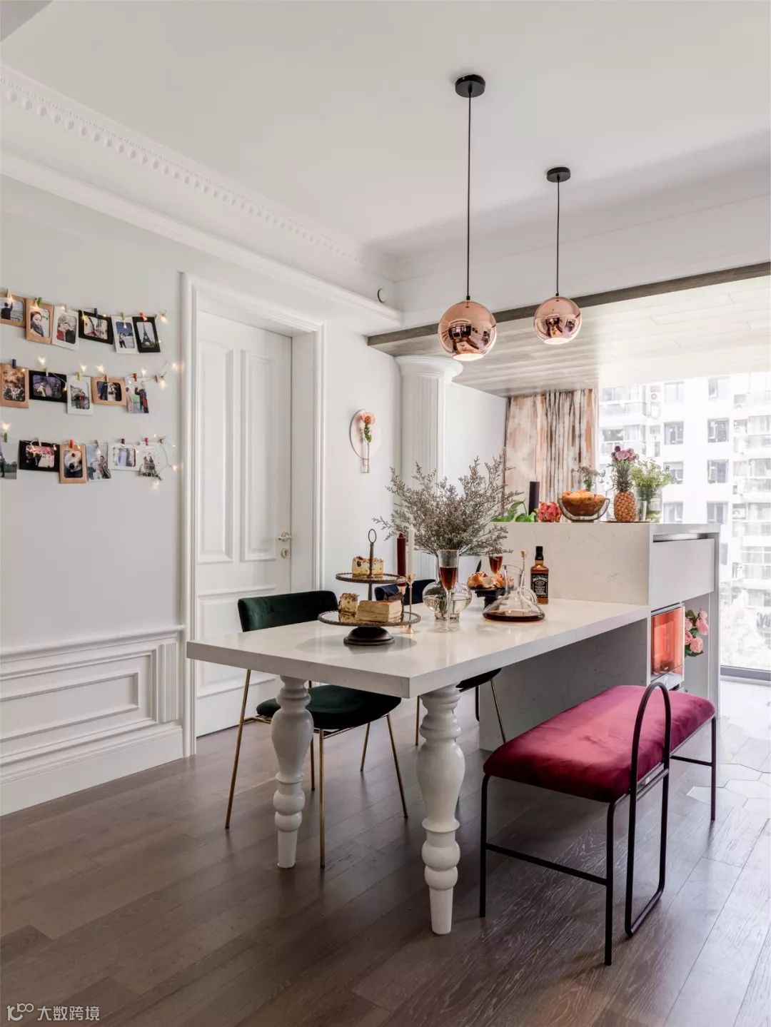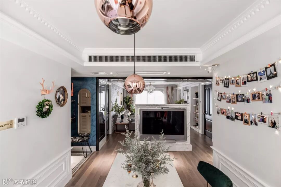 ▲ 餐桌上方的大型吊灯,在调节餐桌食物亮色的同时,与客厅的天花板吊灯两两相映。餐桌后的全身镜与衣帽架并列,既有利于进行外观打理,也可映照室内陈设,别有一番风味。