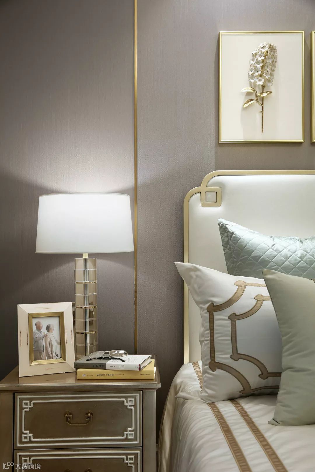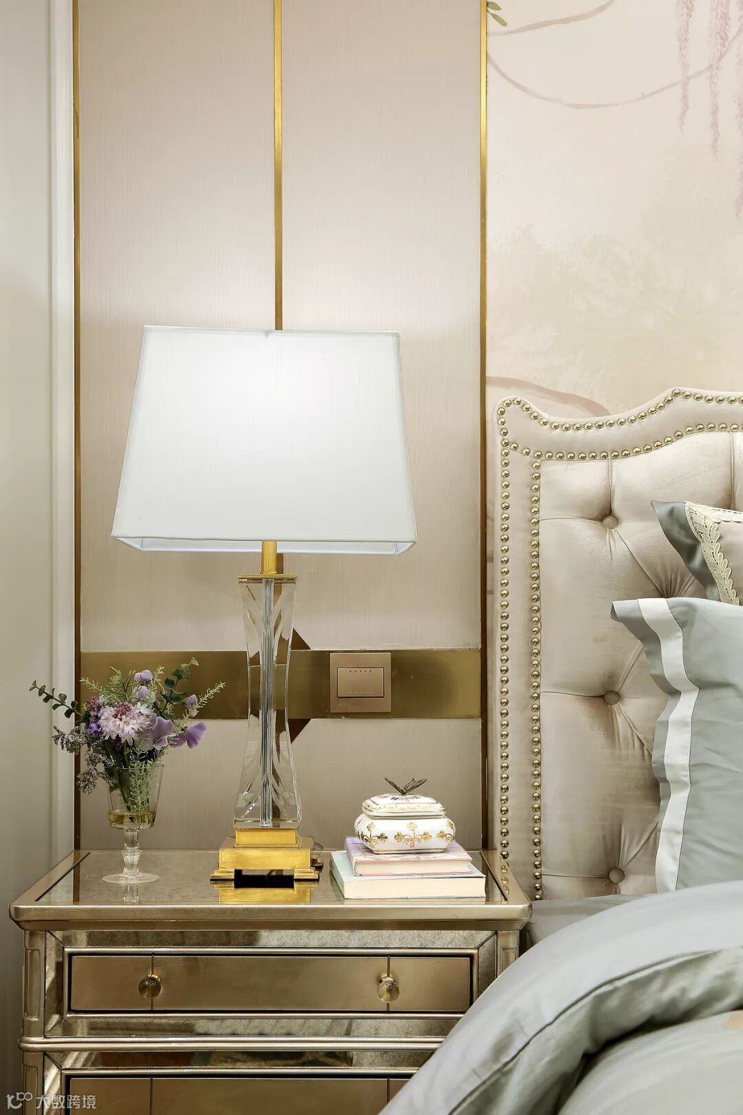 ▲ 金属搭配玻璃质感的床头灯,以及床头柜上的香薰布置,低调而奢华。
