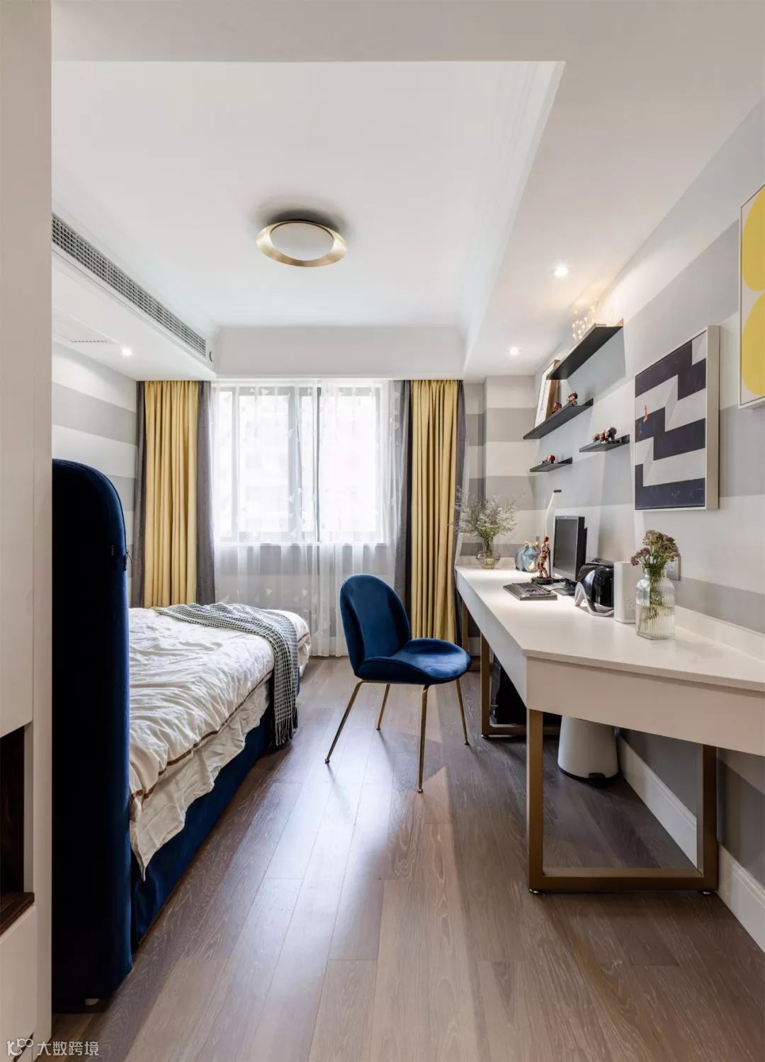 ▲ 主卧选择了灰色系护墙板,配合墨绿色丝绒双人床,再点缀以金色装饰,精致得恰到好处。
