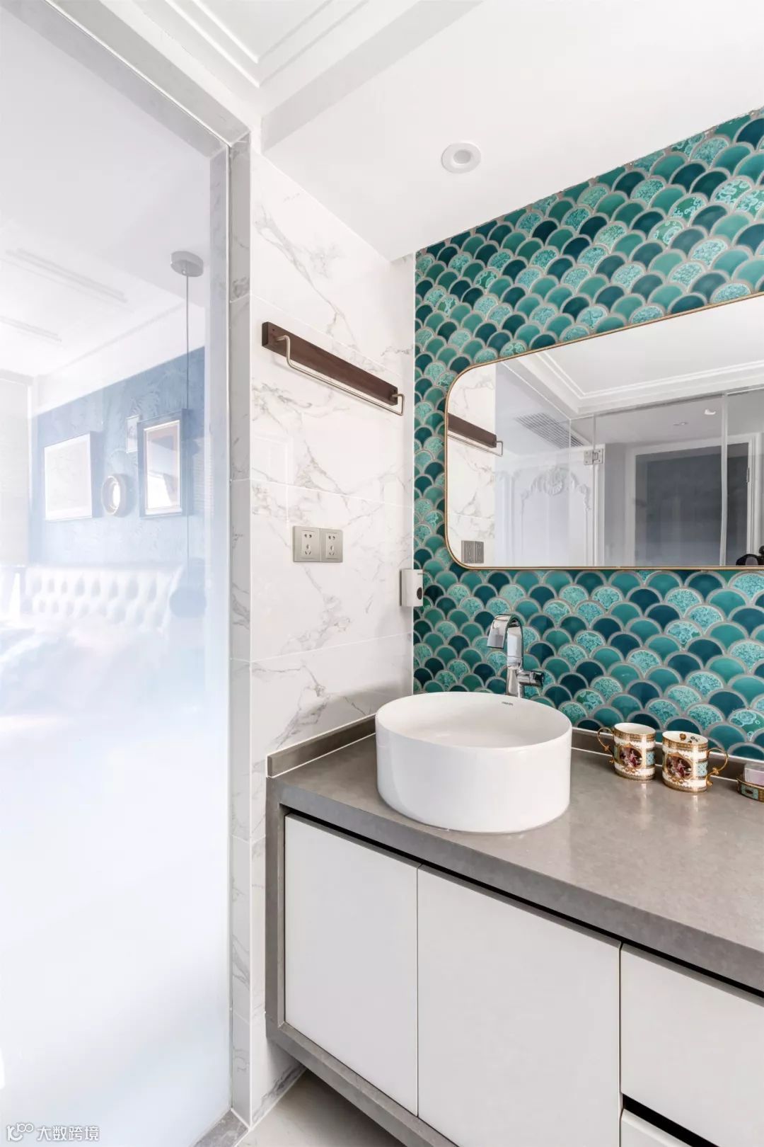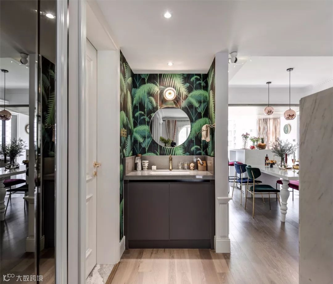 墨绿棕榈树墙纸,黄铜镜子与石材壁灯的组合,让这个干区美得不动声色。