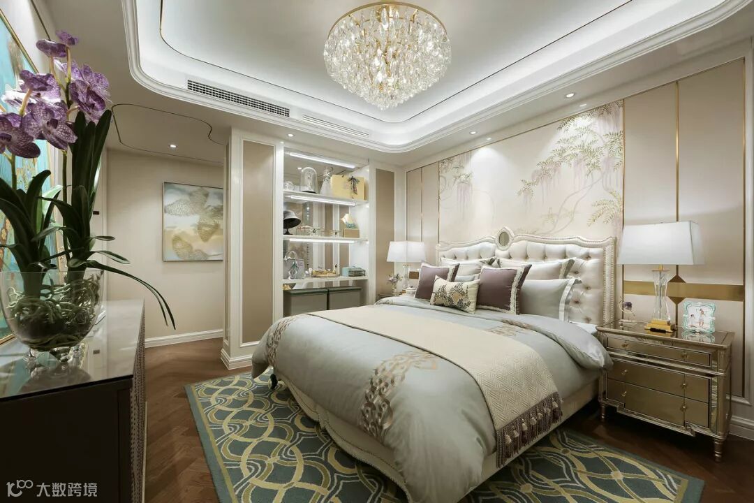 典型的法式中轴对称布置,摩登又不失温馨。床与床头柜典雅舒适,水晶吊灯华美晶莹,与陈列有序的小物品融合在一起,优雅平和的色调营造完美舒适的卧房空间。