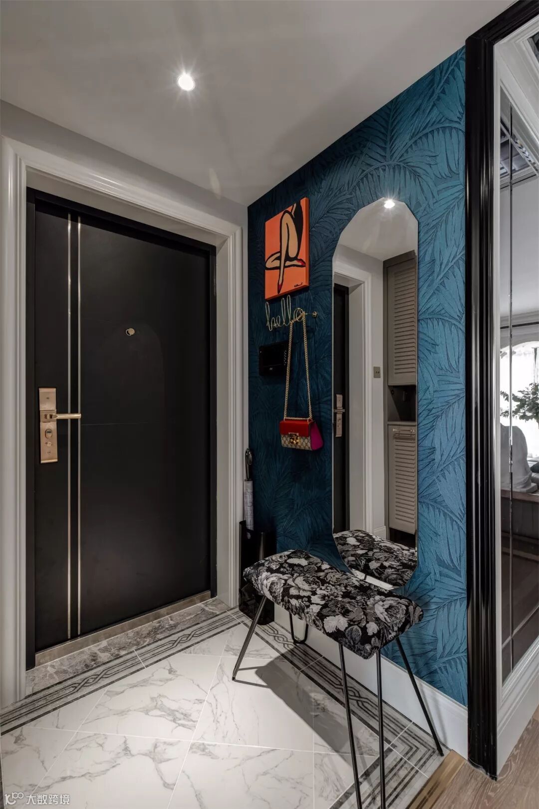 玄关地面采用的是经典法式花纹围边,与黑白花卉图案的长脚凳相呼应。