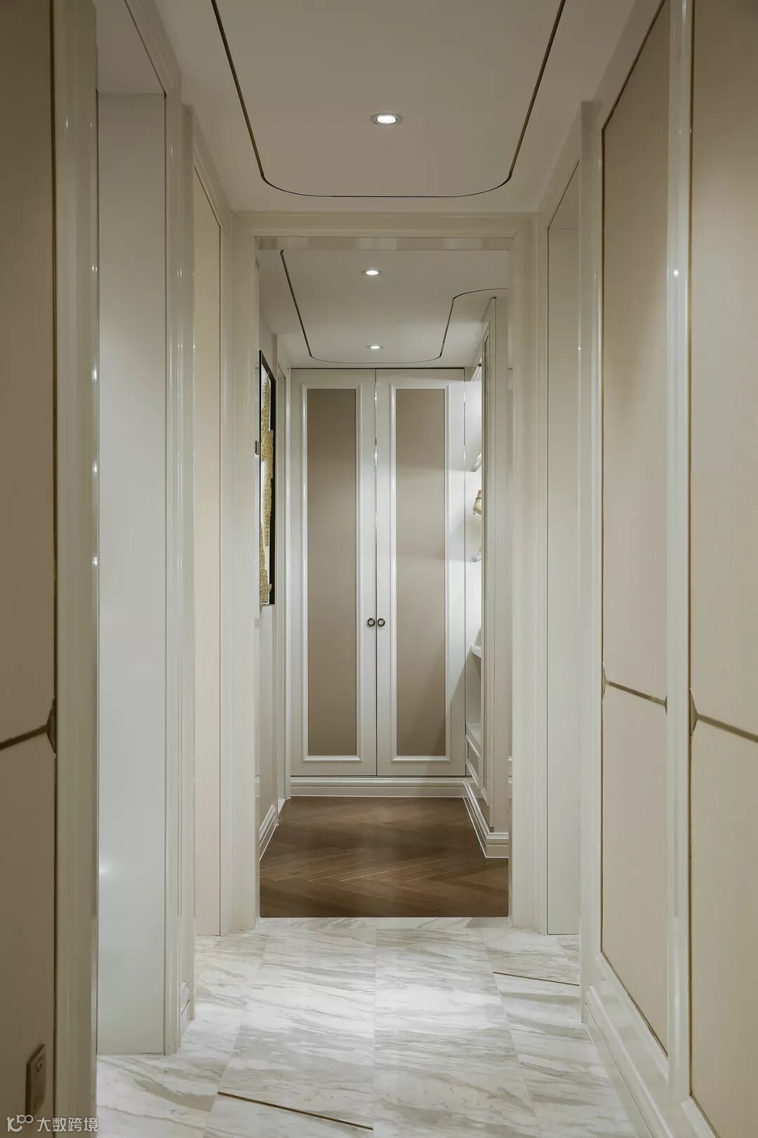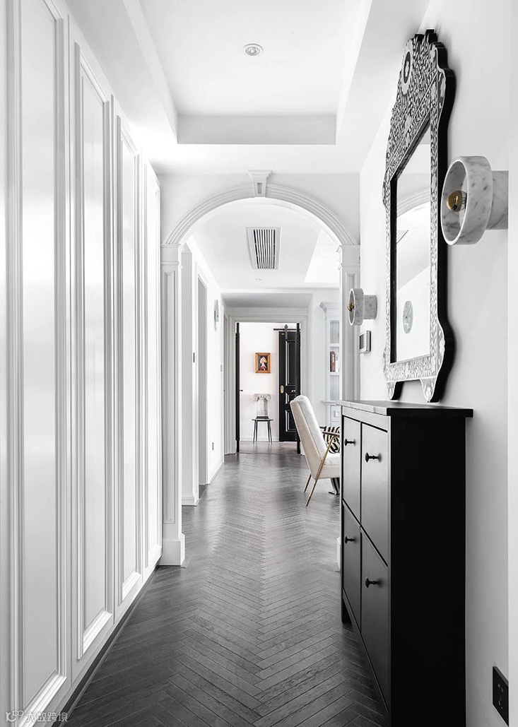 ▲ 走进玄关,映入眼帘的是充满法式风情的弧形拱门,对应着走廊尽头的古董油画和罗马柱凳,给人诗意轻奢的第一印象。
