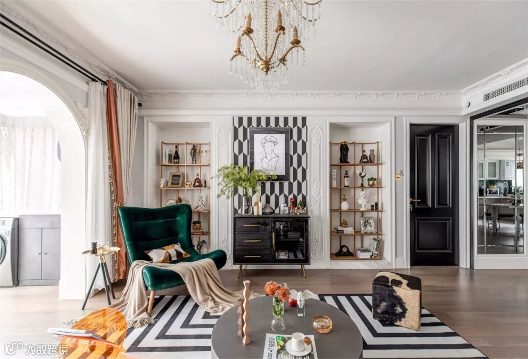 黑色的复古边柜显得沉稳不张扬,同时也沉淀了客厅的摩登气质,墨绿色的双人沙发椅,使整个氛围充满了法式的浪漫韵味。