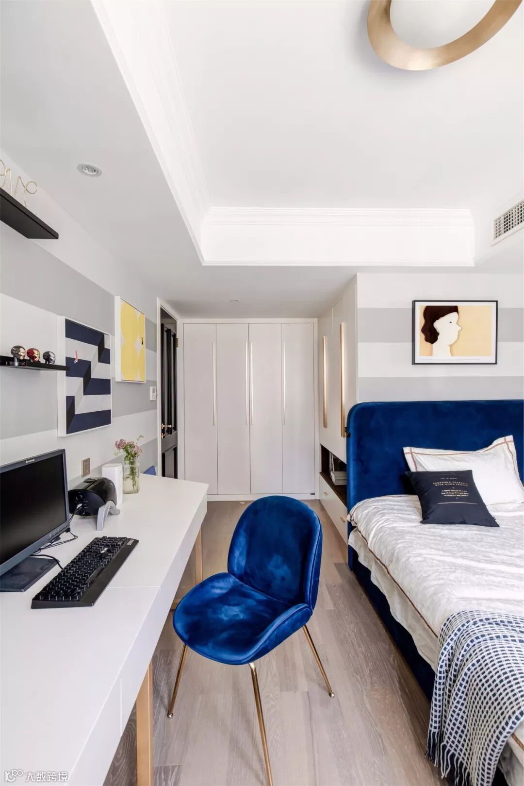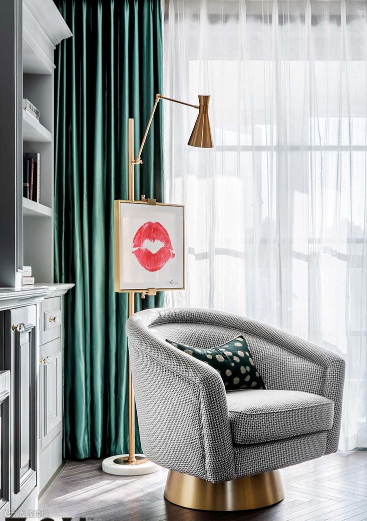 ▲ 衣帽间兼书房的功能,一整面衣柜满足屋主的收纳需求,衣柜的圆形造型和拉环把手灵动又摩登。另一侧选用金色透明书架,让空间更加开阔。