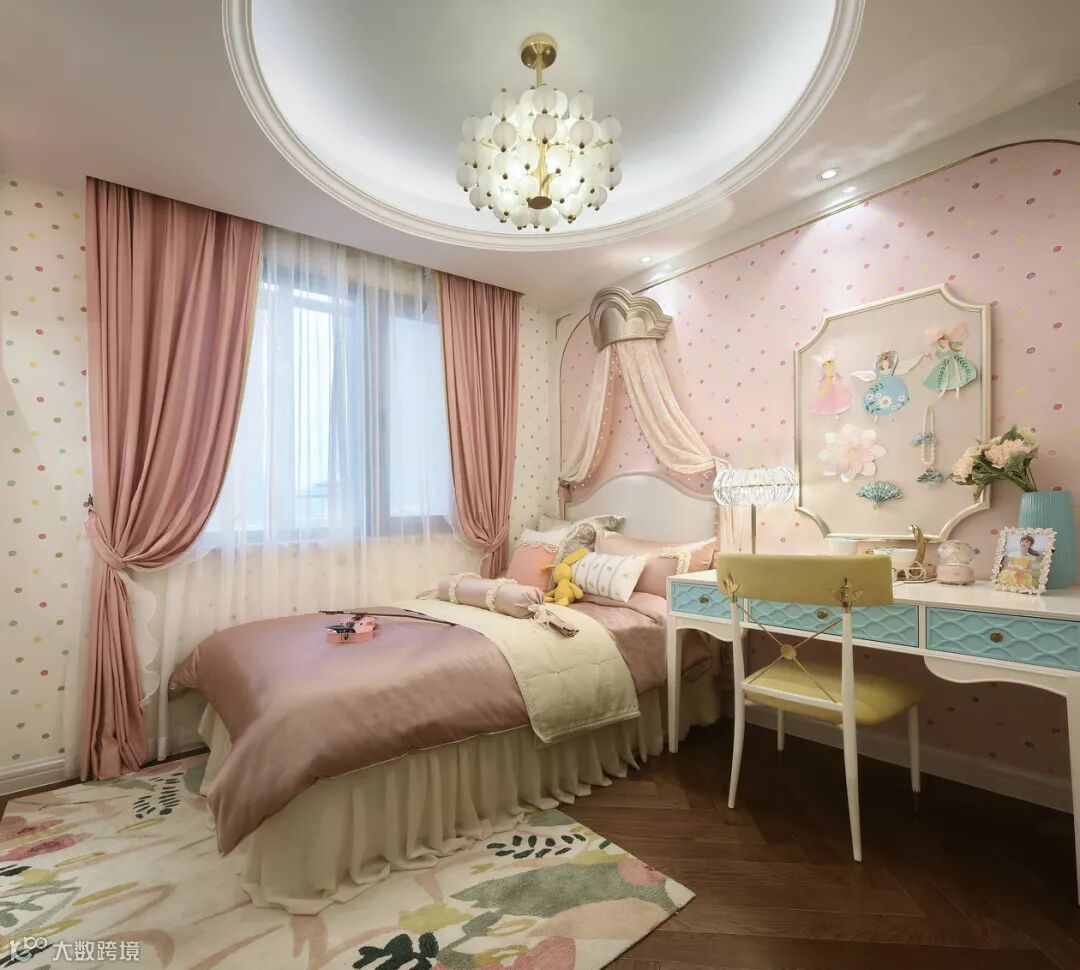 ▲ 女孩房则以女儿尤为喜爱的粉色为主调,床头靠背以及吊灯造型都形似“皇冠”,满足小公主的少女心。